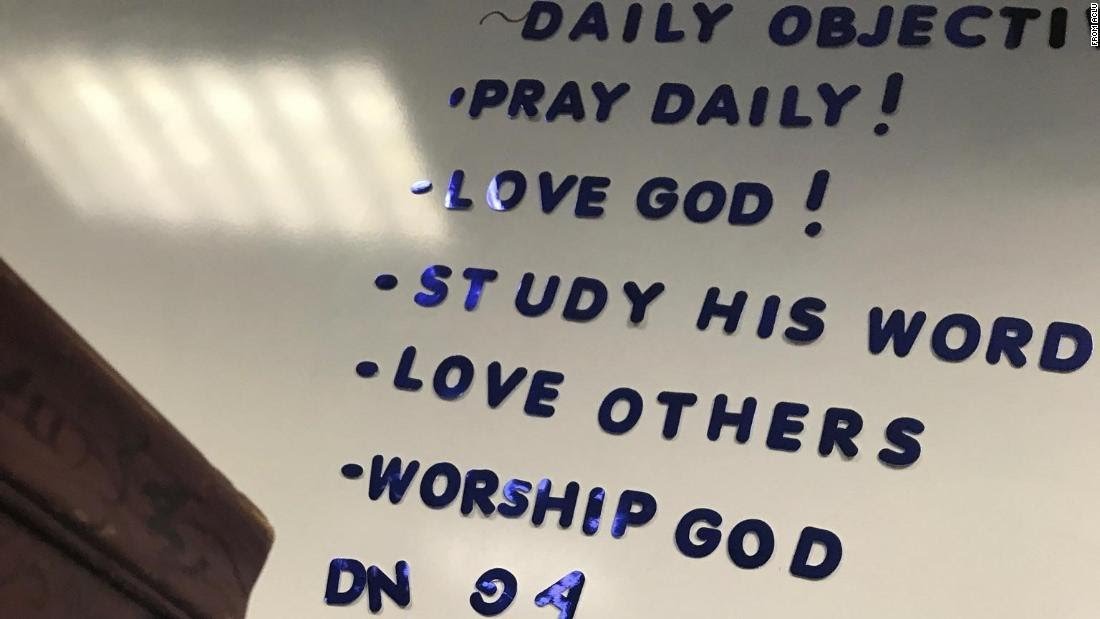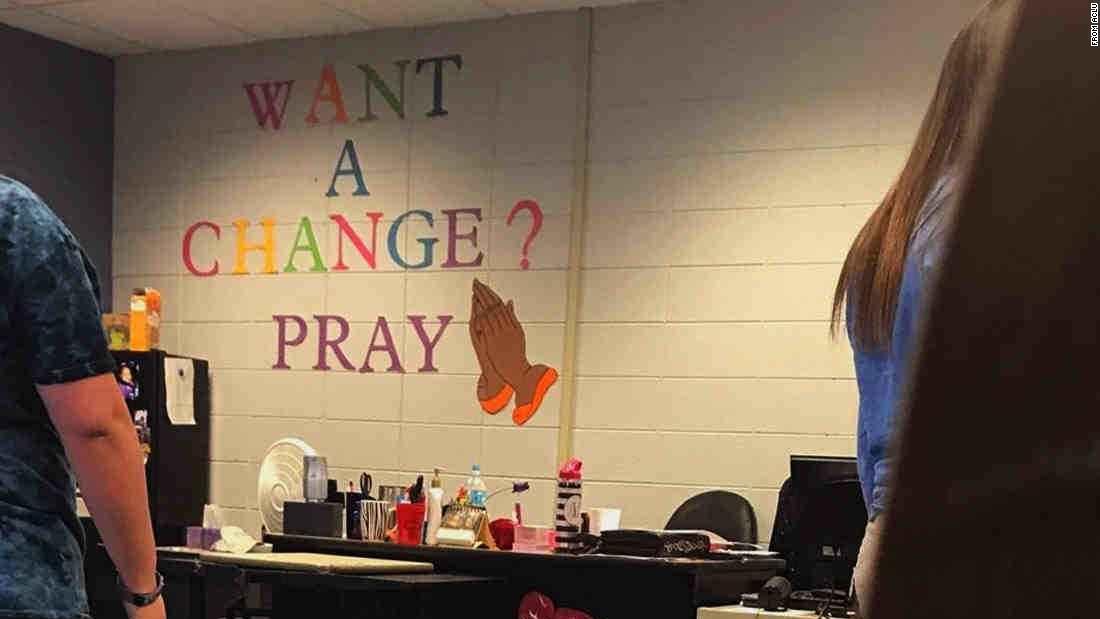 Kaylee, who is a senior at Lakeside Junior-Senior High School was also not a fan of some of her teacher’s classroom art which read: “Want Change? Pray.” The class daily objectives listed on the wall included: “Love God,” “Worship God,” “Read the Bible.”